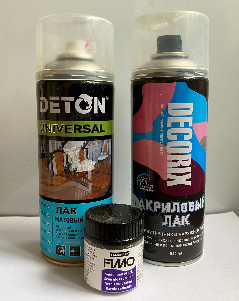 Использую редко. Раньше использовал разведенный водорастворимый глянцевый лак FIMO для сохранения блеска перламутровых аммонитов.