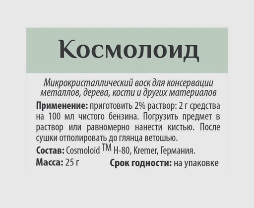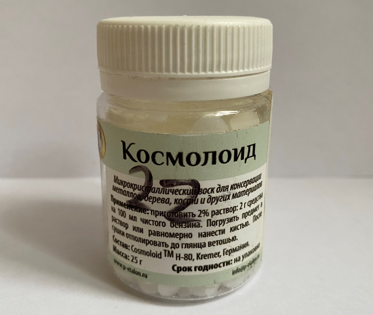 А так же, Космолоид Н-80 (Cosmoloid H-80) - бескислотный микрокристаллический воск, получаемый при переработке нефти. Его применяют для покрытия поверхности ордовикских трилобитов Ленобласти.