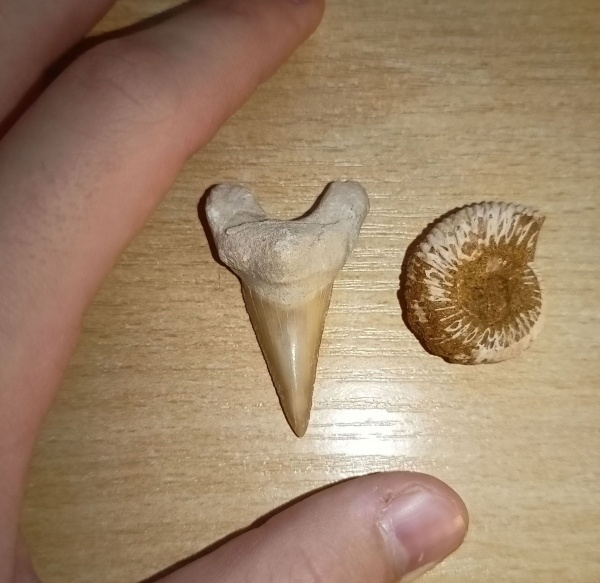 Это 2 окаменелости . Аммонит вида Perisphinctes (юрский п.) и зуб акулы (меловой п.) вида Octobus. Аммонит найден в известняке , а зуб в песке .