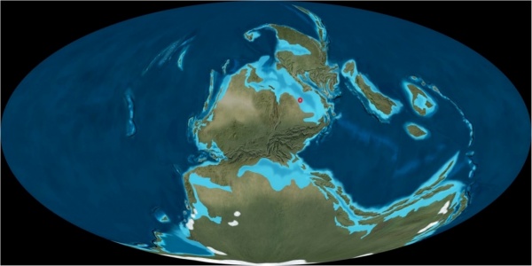 Рисунок 1 Планета Земля 310 миллионов лет назад. Красным кружком отмечено местоположение современной Москвы. Источник: deeptimemaps.com