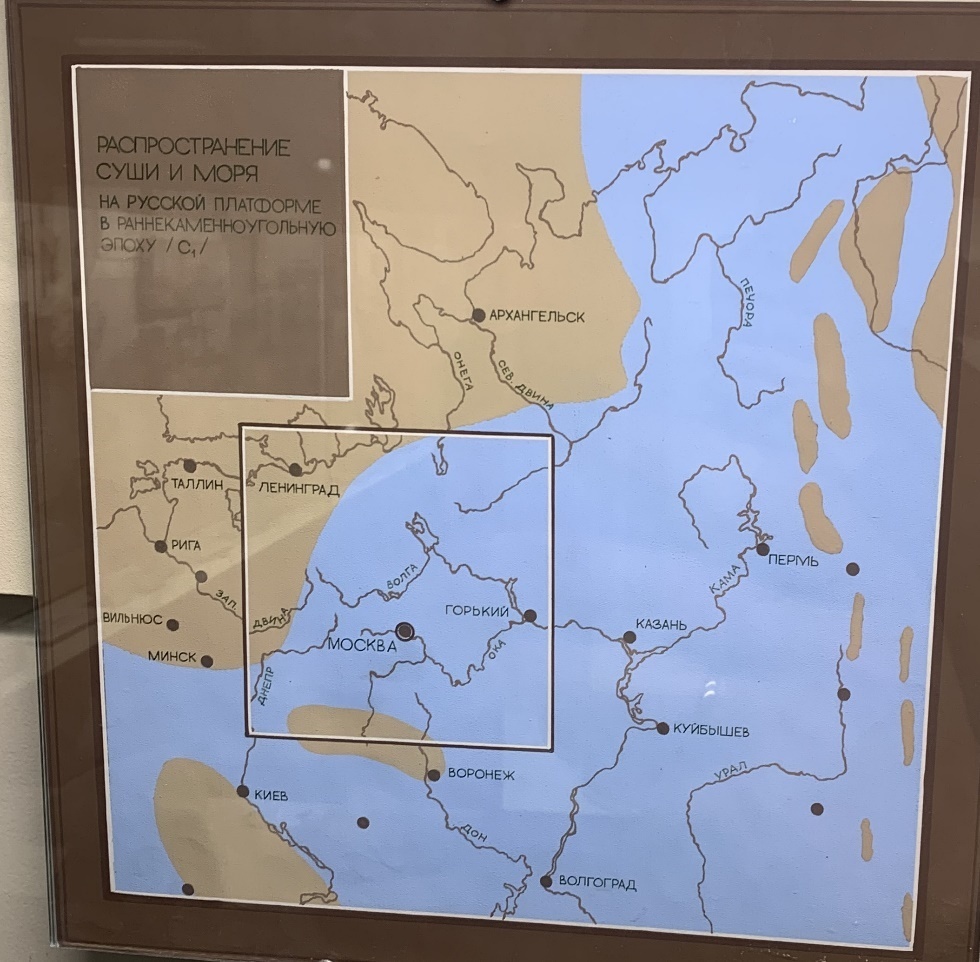 Рисунок 2 Распространение суши и моря на Русской платформе в Каменноугольном периоде. Палеонтологический музей им. Ю. А. Орлова. Фото из личного архива автора.